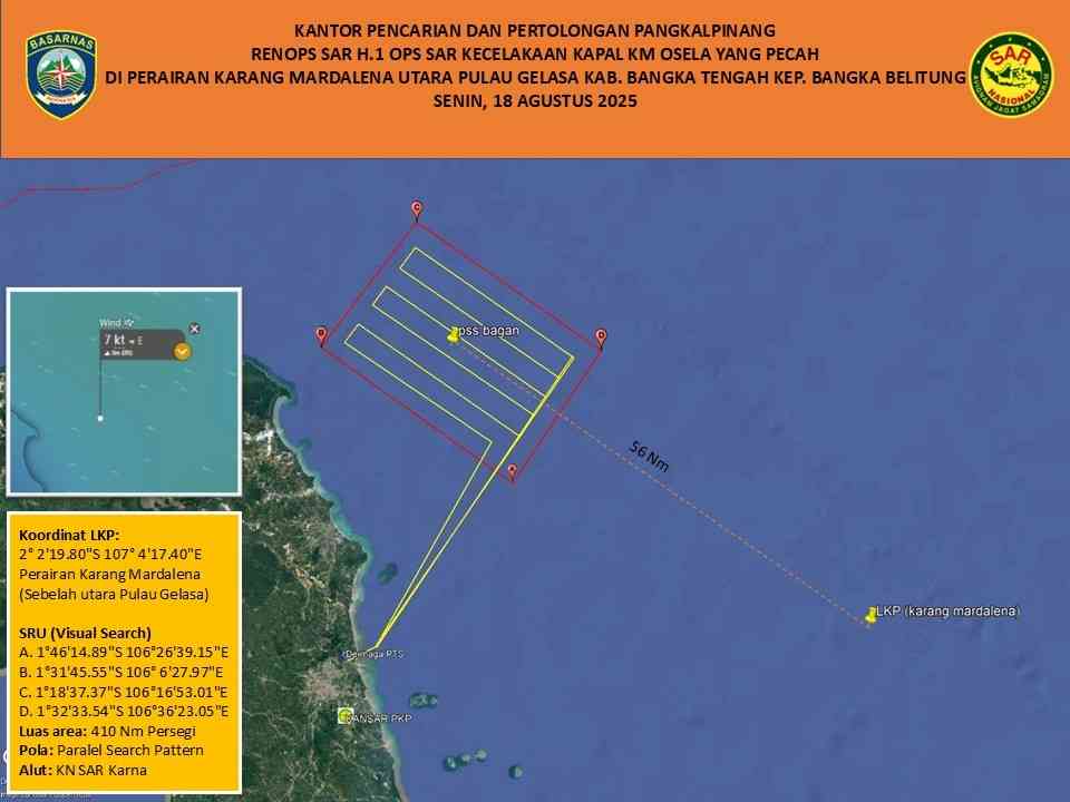 “mendapatkan informasi tersebut kami membuka operasi SAR gabungan dan memberangkatkan 1 Tim SAR gabungan menuju LKP untuk mengevakuasi korban yang pertama ditemukan dan selanjutnya melaksanakan pencarian dengan KN SAR KARNA” tambah I Made Oka Astawa di Kantor Pencarian dan Pertolongan Kelas B Pangkalpinang.